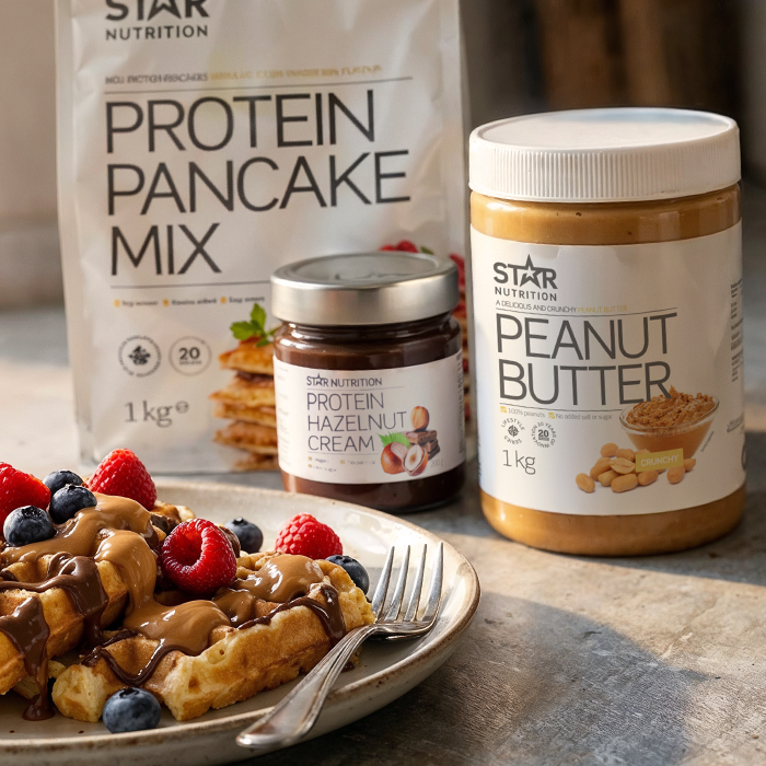 Star Nutritions nye protein pandekager er et sundere alternativ til de traditionelle pandekager. Hver portion (3-6 pandekager) indeholder hele 30 g højkvalitets protein og samme tid under 180 kalorier. De er desuden helt fri for tilsat sukker.
